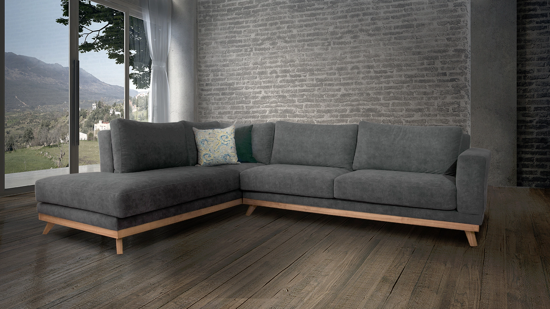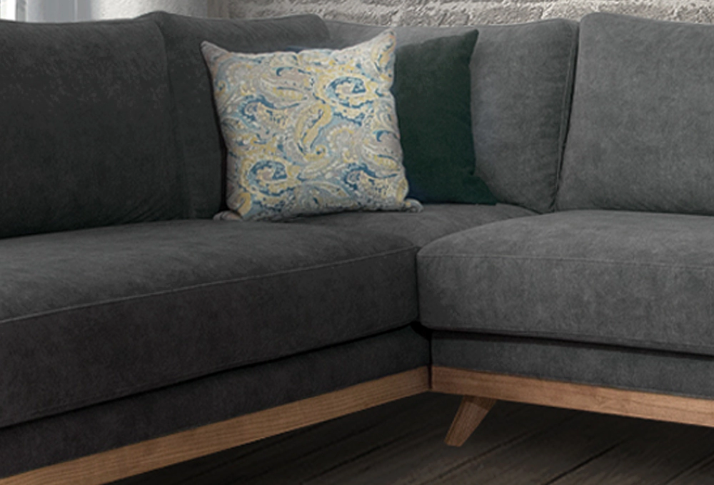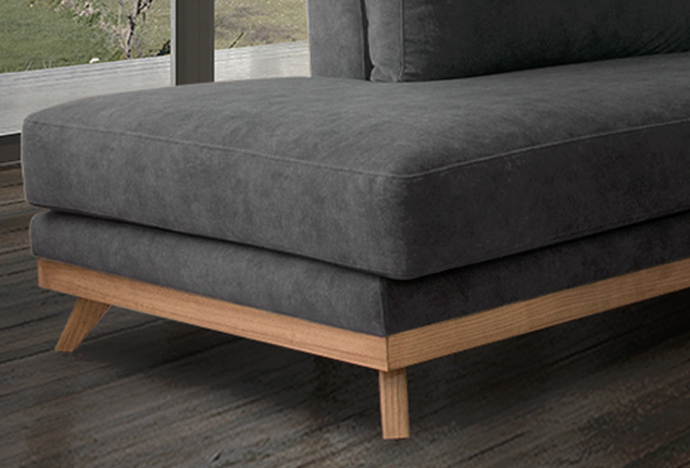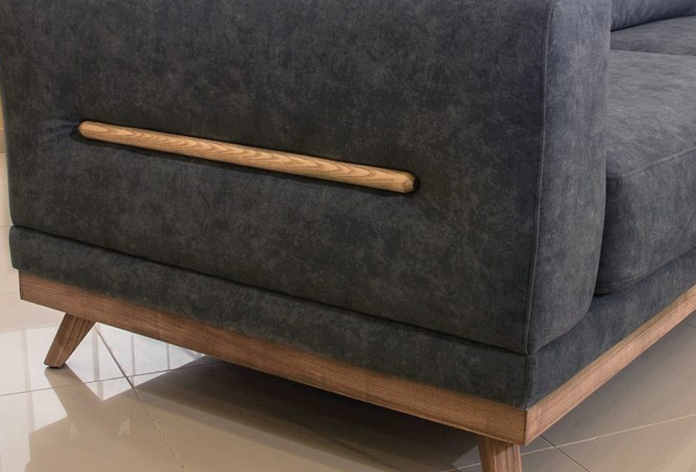 Η λεπτομέρεια του περιμετρικού ξύλου στο κάτω μέρος του καναπέ, σε απόλυτη αρμονία με τα καλαίσθητα πόδια του, δημιουργεί μια ιδιαιτέρως εντυπωσιακή βάση. Το φυσικό υλικό του ξύλου προσθέτει θερμότητα και χαρακτήρα, ενώ η αντίθεση με το ύφασμα ενισχύει την κομψή του παρουσία.