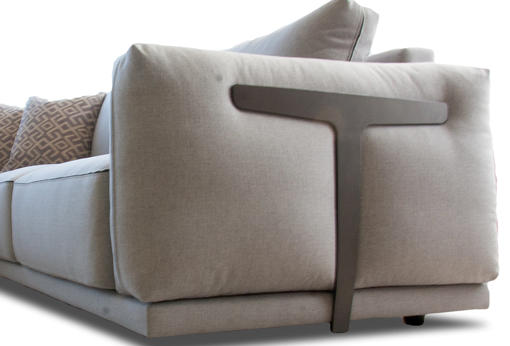 Η κομψή του γραμμή επιτρέπει να ενσωματωθεί αρμονικά σε κάθε σπίτι, είτε κλασικό είτε μοντέρνο, ενώ το ιδιαίτερο στοιχείο που τον χαρακτηρίζει είναι το μεταλλικό Τ που αγκαλιάζει πλαϊνά το μπράτσο, προσδίδοντας μια διακριτική, αλλά εντυπωσιακή, σχεδιαστική νότα.